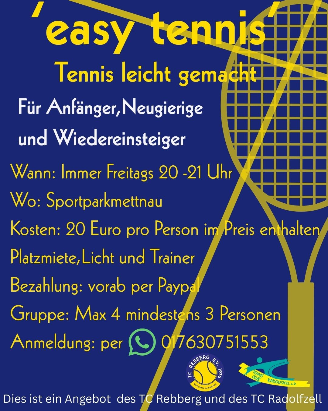 Das Angebot richtet sich an alle, de schon immer Lust auf Tennis hatten. Oder Wiedereinsteiger. Ort: Sportpark Mettnau Schießhüttenweg 2 Radolfzell Das Angebot wird von lizenzierten Trainern durchgeführt, mit einer DTB – Lizenz Kosten 20 Euro pro Person. Darin enthalten: die Platzmiete incl. Licht, Trainingsbälle und Trainerkosten. Gruppengröße...